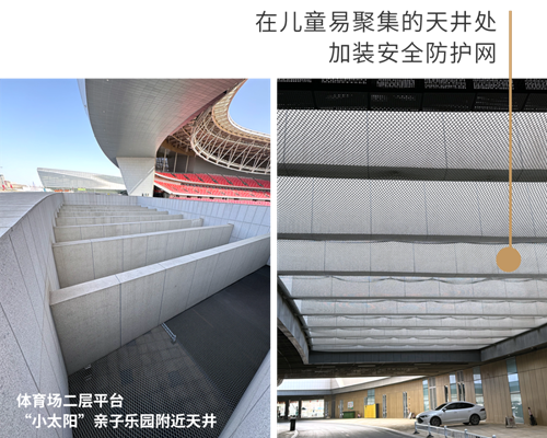快樂成長,安全為先。為了確保兒童游樂區(qū)的安全,鄭州奧體中心從細(xì)節(jié)處著手精心加裝了多種防護(hù)裝置,在奧體中心西北角區(qū)域加裝隔離花箱、石墩,確保行人與機(jī)動車分離。同時,在體育場二層平臺兒童聚集較多的天井內(nèi),加裝防護(hù)網(wǎng);在健身器材一側(cè)加裝防護(hù)欄;在通往二層平臺的步梯兩側(cè)加裝防滑球......這些防護(hù)裝置均經(jīng)過嚴(yán)格的現(xiàn)場論證和質(zhì)量檢測,確保其具有優(yōu)異的耐用性和穩(wěn)定性。通過這些措施,鄭州奧體中心致力于為孩子們打造一個既充滿樂趣,又安全無虞的游樂環(huán)境。