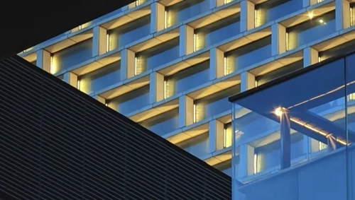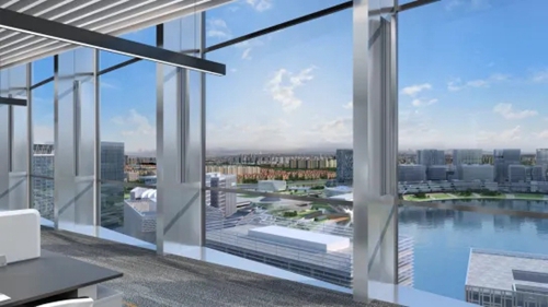 城發(fā)中心以“嵩山書頁巖”為設計理念,以中空LOW-E玻璃打造極簡幕墻立面,玻璃寬約3米,隱藏式開啟窗。